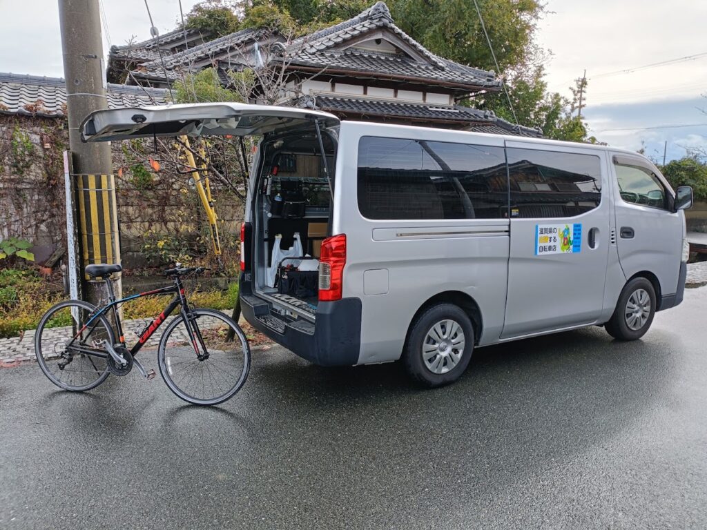 高島市城山台で一般車の後タイヤ&チューブ交換をしました。作業後にはお客様と高島市や湖西地区の魅力について沢山お話しする事ができました。ありがとうございました。電車やバスが少ない地域だからこそ自転車の利便性が際立つと思います。出張修理も頑張っていこうと思います。