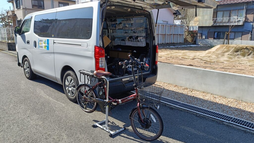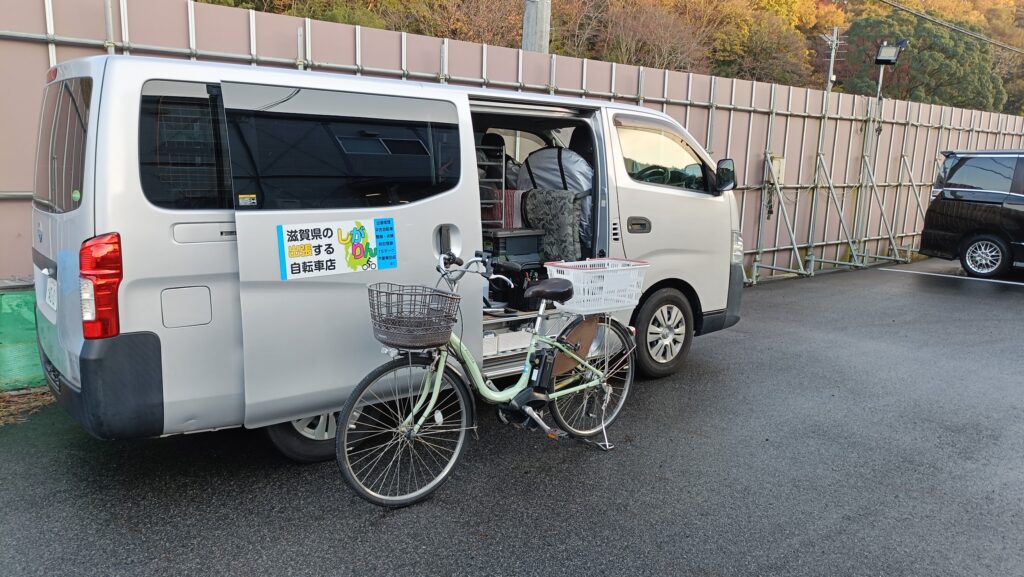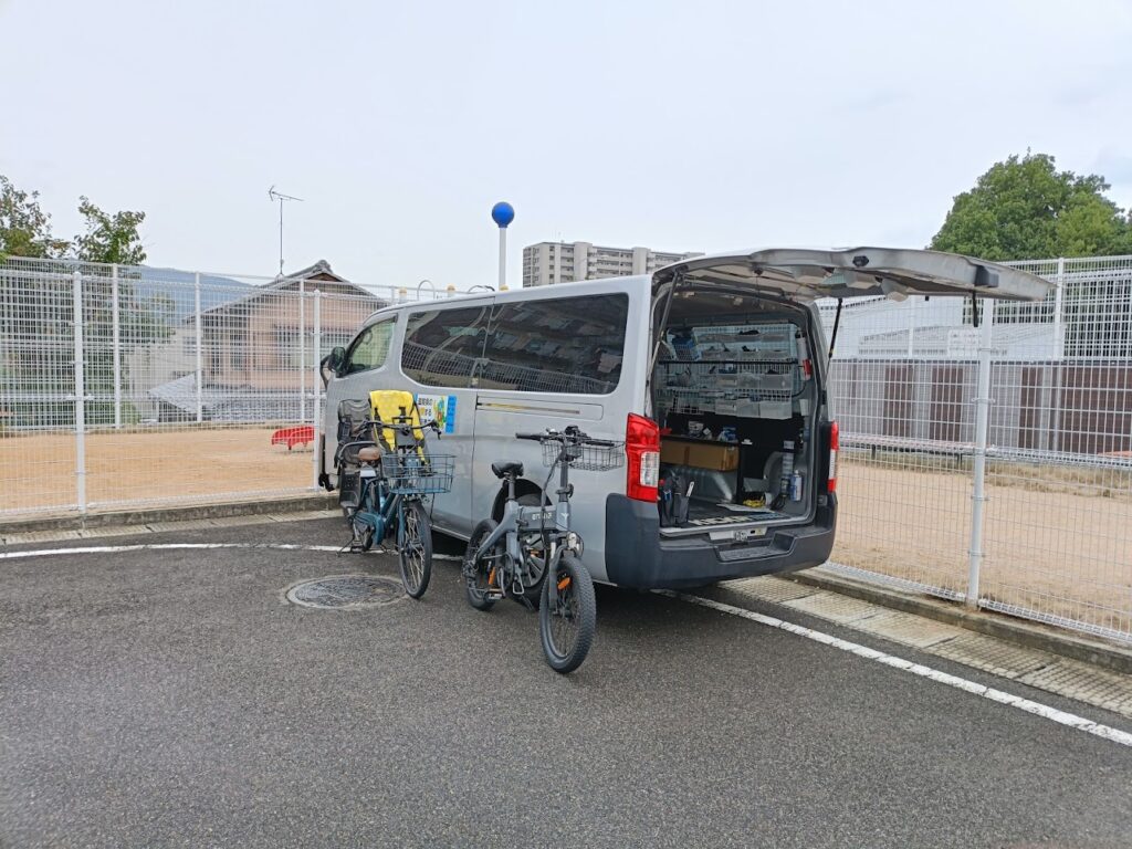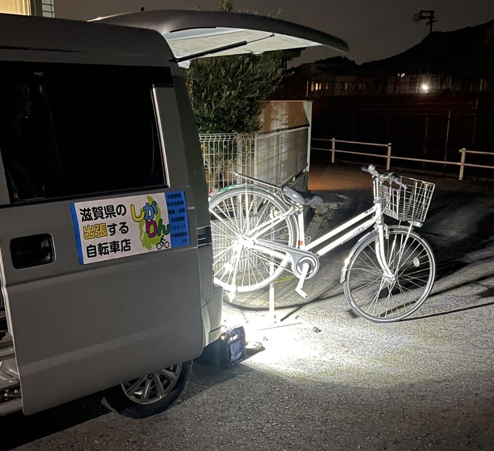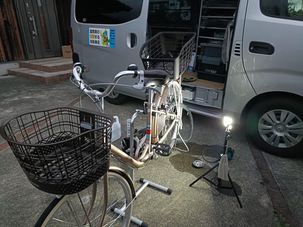 大津市瀬田で2台の修理(電動自転車の同乗器取り外し・電動小径自転車の前後水しらべ)をしました。自転車店の少ない地域でも出張対応できます。カゴや同乗器の取付けなど自転車に関する事でしたらお気軽にご相談ください!