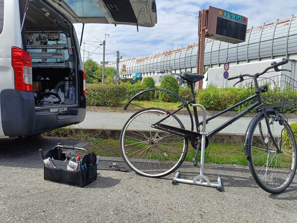 大津市稲津で一般車の後チューブ交換をしました。通学に使用されている自転車でパンク後も少し走行してしまったとの事ですがチューブ交換だけで大丈夫でした!毎日使用する自転車も出張修理なら当日の夜に対応できる場合もあるので是非お気軽にお問い合わせください。